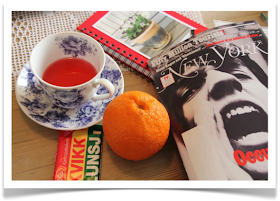 Påska sniker seg liksom inn, så dette med påskeadvent er nok helt på sin plass. Kombinasjonen kvikklunsj og appelsin funker innendørs også, ikke bare i skiløypa. Som for eksempel når man skriver årets første oppdatering i hagedagboka, og leser igjennom gamle New York Magazine før de går til resirkulering. Hva som er i koppen kommer vi tilbake til; den nærmer seg grensa til hva jeg klarer av rødfargede teer.